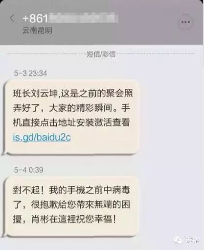 装熟人诈骗也从QQ群转移到了短信上,网上最近曝光了这种诈骗的方法,其中比较典型的一个就是“最近在干吗呢?我整理了一些相片,地址:t.cn/RAnnYVv”这样的短信,该短信网址里就包含了一个盗号木马程序。